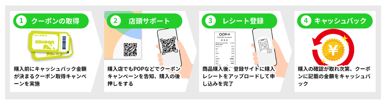 店頭で悩んでいるタイミングでキャッシュバック型のキャンペーンに参加していただくと、お客様はその商品を購入すれば必ず還元される特典を獲得することができます。 これにより「せっかくキャッシュバックされるなら今買ってみようかな」と購入意欲を自然に向上させ、購買へとつなげるキャンペーンとなっています。