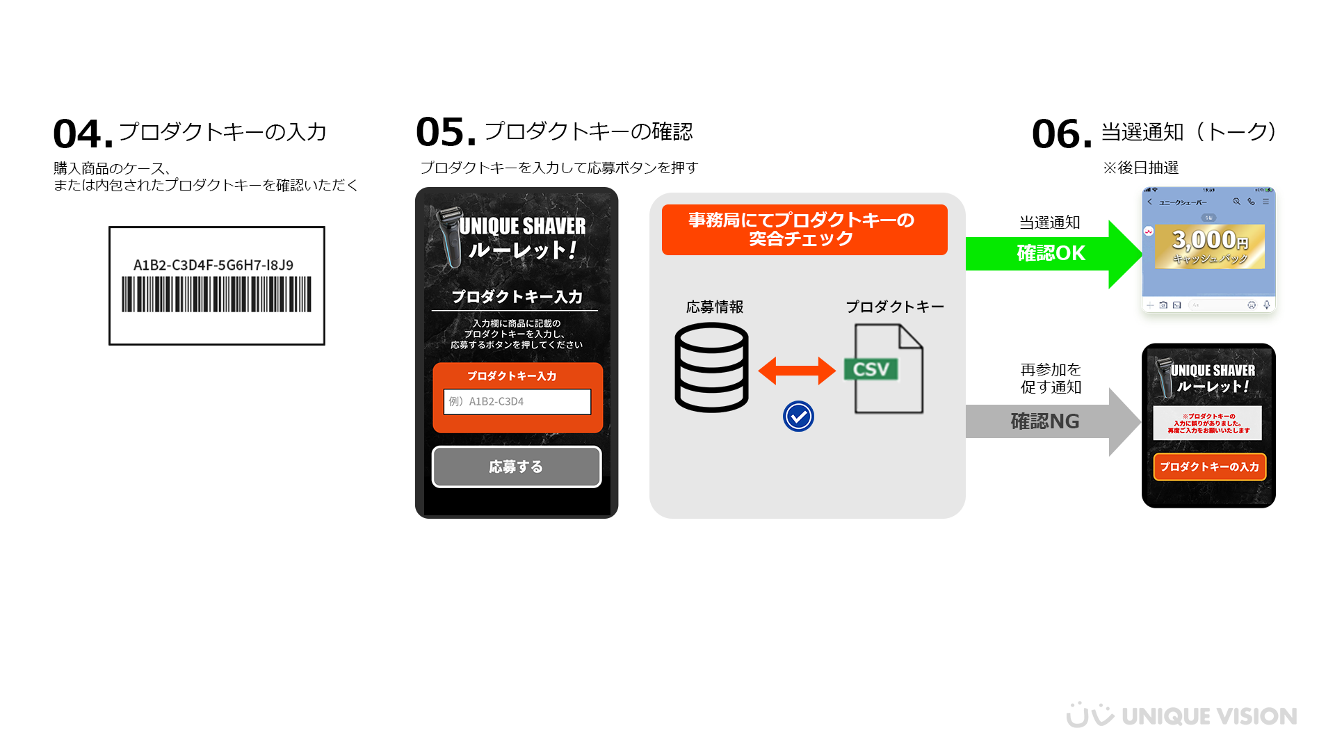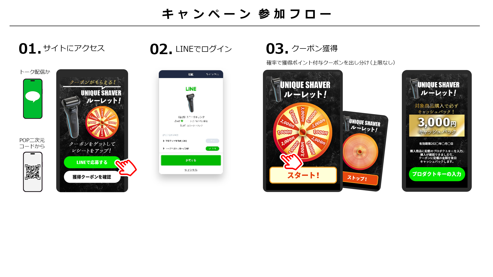 本施策は、店頭のPOP等からLINEでキャンペーンに参加し、その場で抽選を実行した後、当選したキャッシュバック金額を確認した上で対象商品を購入してもらうという流れです。