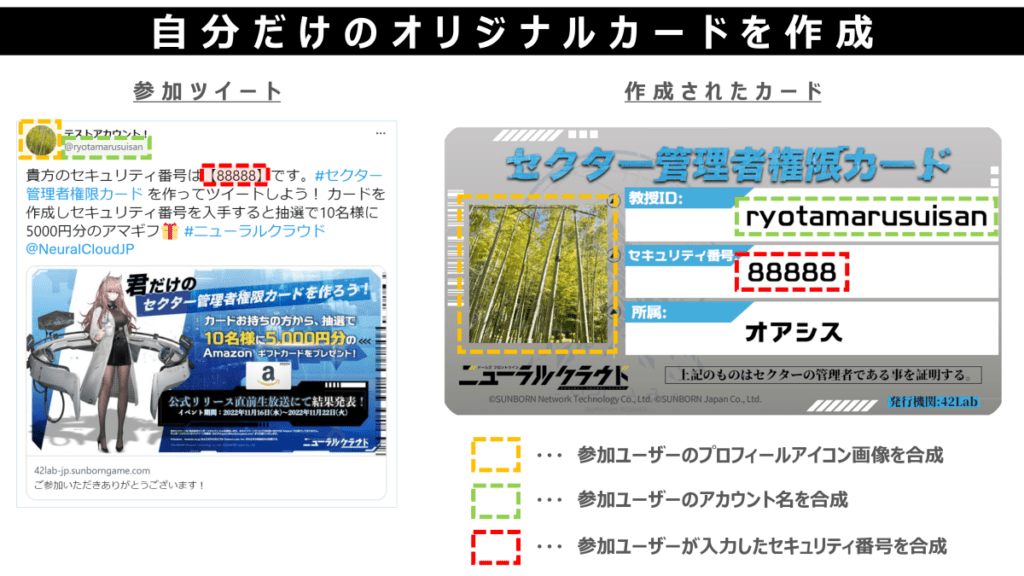 ツイート後には自分だけのセクター管理者権限カード(オリジナル会員証)がインスタントリプライ(即時返信)機能で届き、作成したカードをTwitterでシェアすると後日行われる抽選に参加できるフローとなっていました。