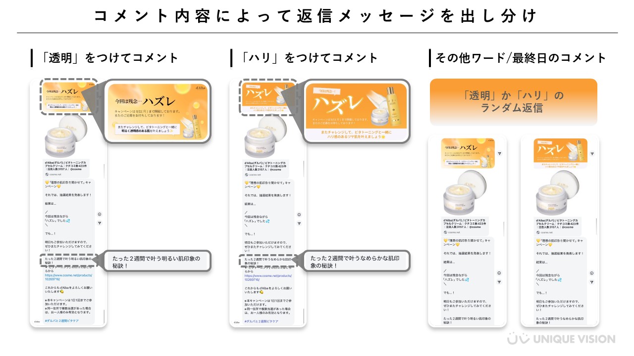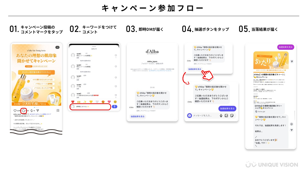 本施策はキャンペーン投稿内の画像に記載の3つから叶えたい肌印象を選んでコメントをすることで参加でき、ユーザーのダイレクトメッセージに自動で届く「抽選結果を見る」ボタンを押すと、すぐに抽選結果が届きます。