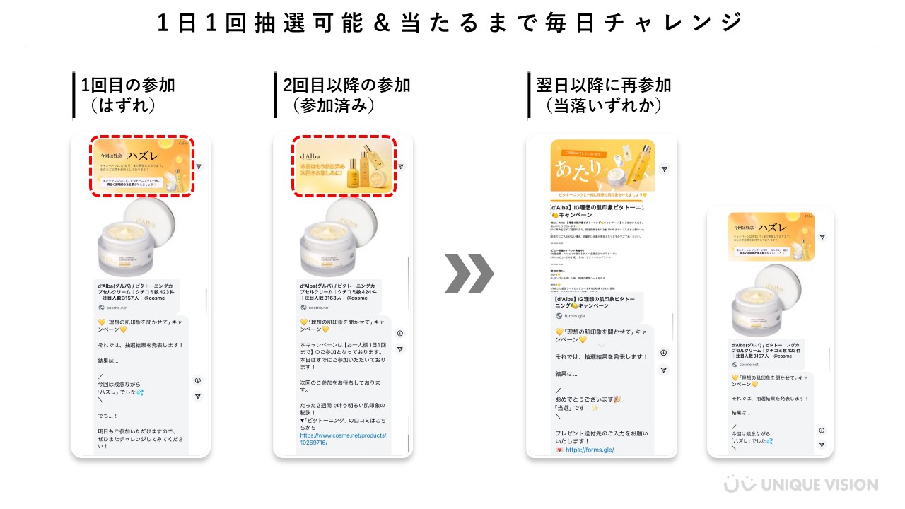 ユーザーは1日1回抽選に参加することが可能で、同日再参加すると参加済みのメッセージが届く仕様となっていました。また、はずれても翌日以降毎日、当選するまで繰り返しチャレンジ出来るため、キャンペーン期間中のブランドへの接触頻度向上に繋がりました。