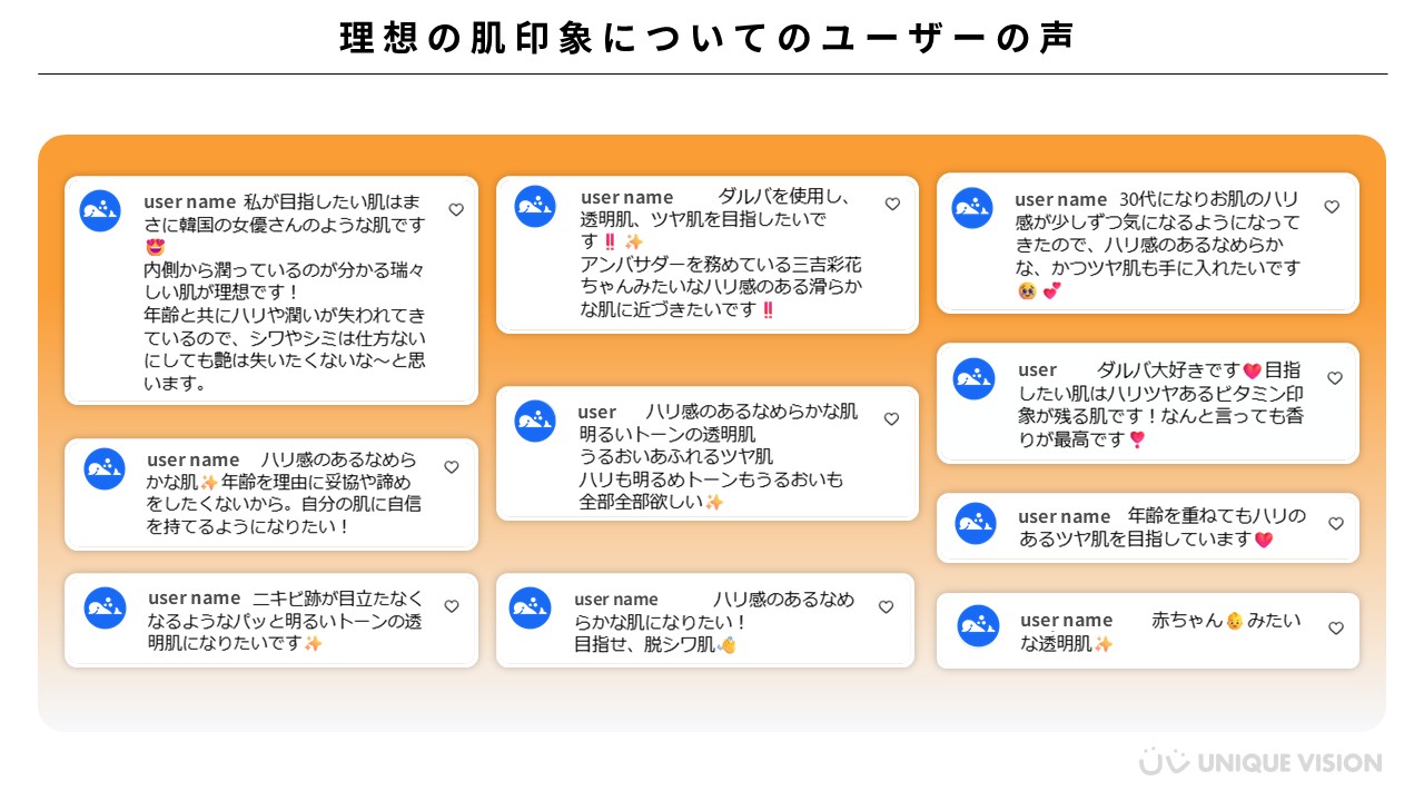 キャンペーン投稿画像に記載された3つの肌印象から自分が叶えたいものを選んでコメントすることが参加条件でしたが、今の自分の悩みやより具体的な叶えたい肌印象などを自ら付け加えるユーザーも多くみられました。結果として、ユーザーの熱量が可視化されるとともに高いエンゲージメントを獲得することに成功した施策となりました。