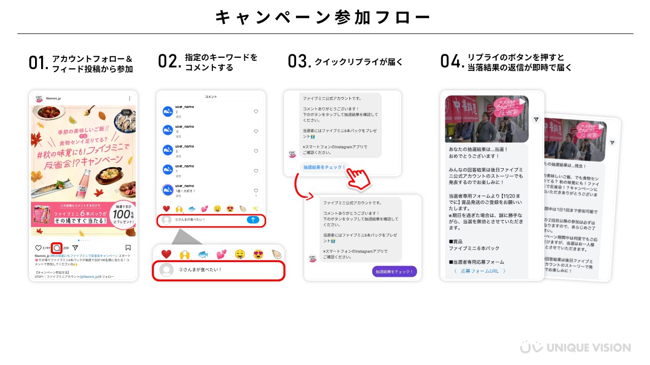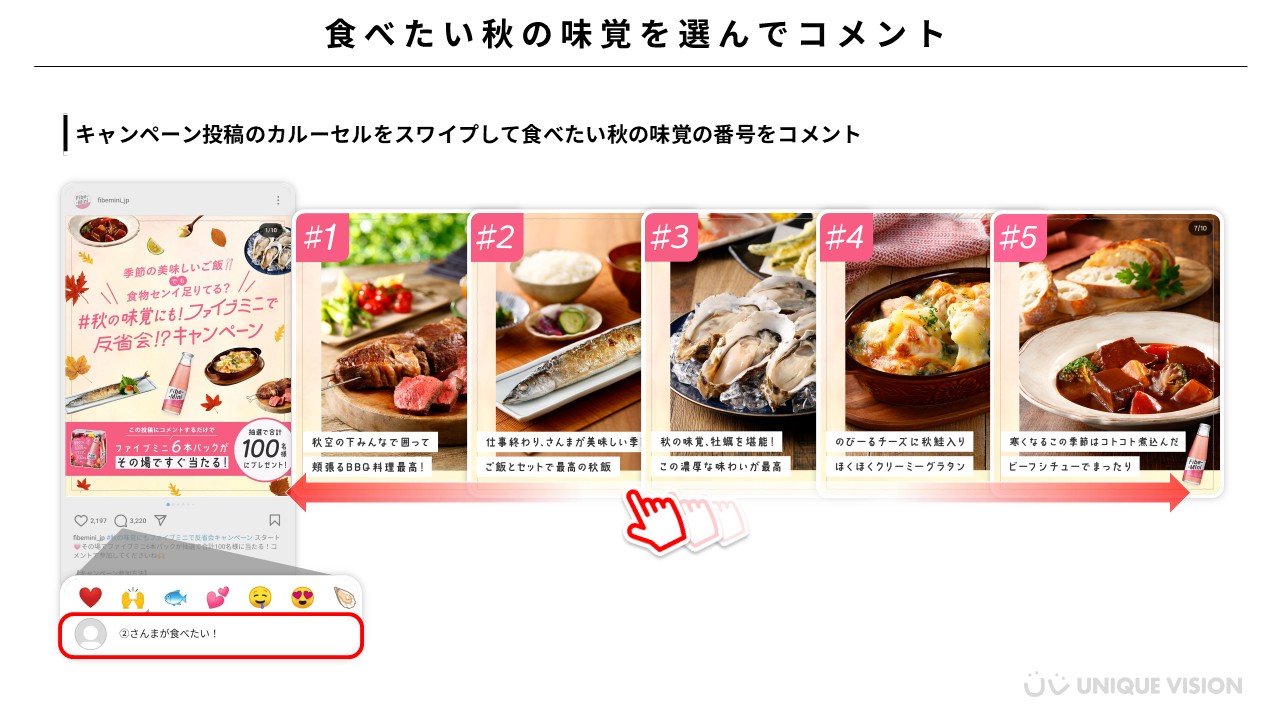 カラフルな画像でユーザーの興味を惹きつけ、「食べたい秋の味覚の番号をコメントで教えてもらう」という、数字一つで完結する手軽さで、ユーザーの積極的な参加を促しています。さらに、「美味しい秋の味覚って、実は食物センイが不足しがちかも?」という問いかけを入れることで、旬の美味しい食事に「ファイブミニ」をプラスする食生活を、魅力的にユーザーに伝えました。