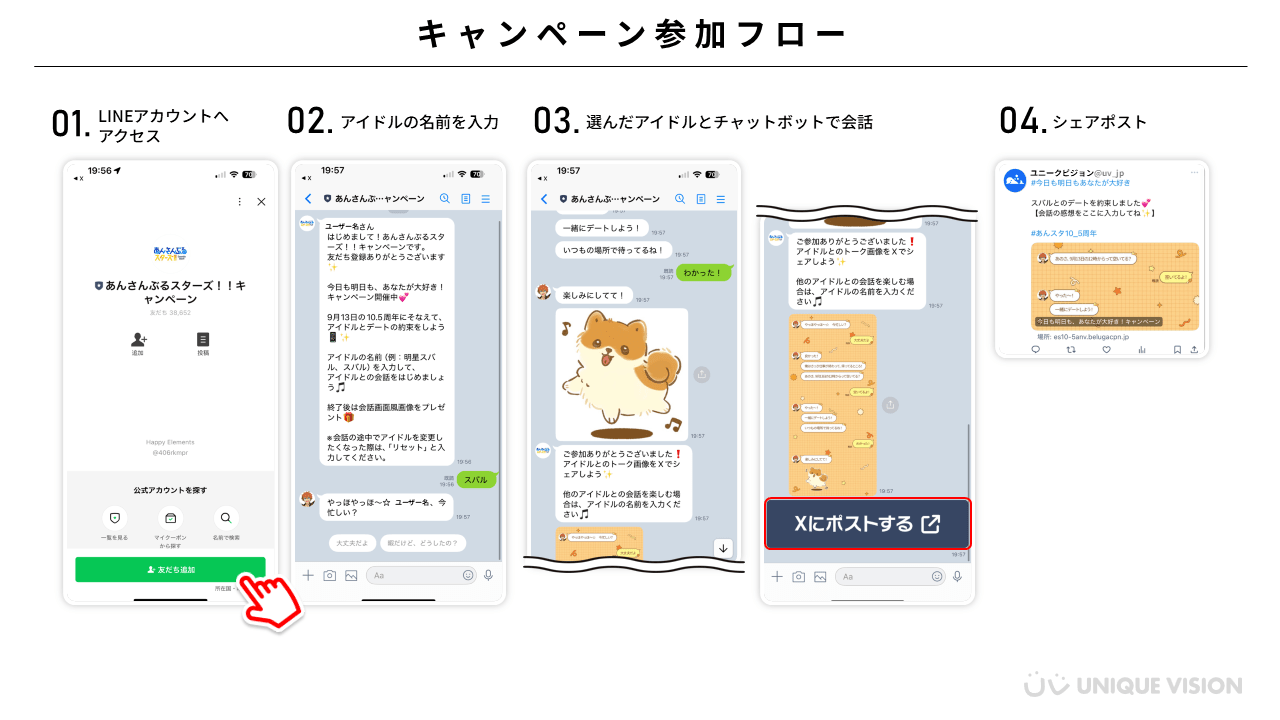 本施策は、『あんさんぶるスターズ!!Bright me up!!』のLINEキャンペーンアカウントを友だち追加後に参加できます。友だち追加後は、会話したいアイドル名の入力、会話の選択を進めていくことで、アイドルとデートの約束を行うことができます。最後にXへのシェアポストもできました。