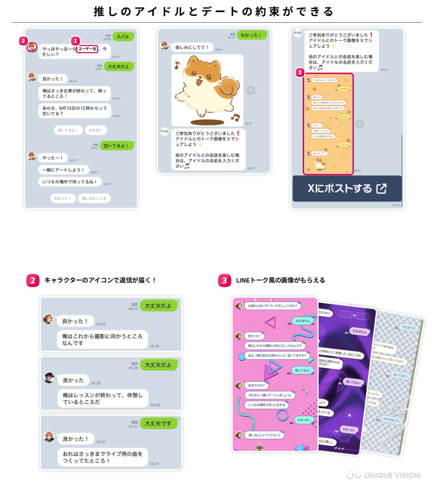 まず最初は、アイドルの名前を入力することで会話をスタートすることができます。アイドルが自分の名前(ユーザー名)を呼んでくれて(①)、アイコンもアイドル画像に変更される(②)ことで本当にアイドルと会話しているような臨場感のある演出をしています。また会話の最後にLINE風の画像(③)をプレゼントすることで、推しとの思い出を形に残すこともできました。