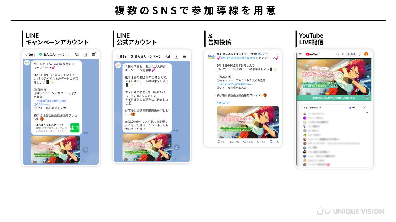 キャンペーンの告知はLINEのキャンペーンアカウントと公式アカウント、Xの公式アカウントに加え、YouTubeでのLIVE配信でも行われました。複数の参加導線を用意することで、より多くのユーザーの目に留まるよう工夫が施されていました。