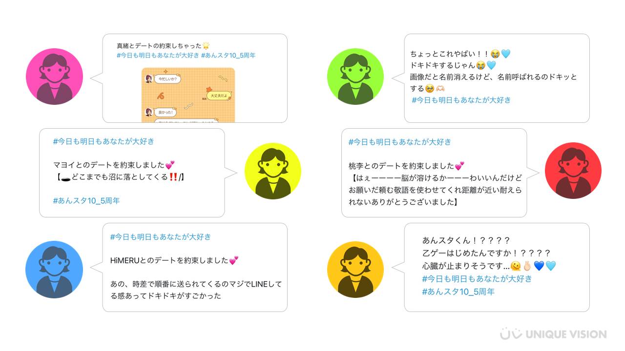 LINEでの会話終了後にXへシェアポストする導線が用意されており、多くのユーザーが推しとのデートの約束をシェアポストしました。そのため、LINEキャンペーンの枠を超えた盛り上がりの醸成に成功し、LINEキャンペーンでありながら「#あんスタ10_5周年」がXトレンドに395分間、最高1位にランクインを果たしました。ユーザーからも喜びの声が多くあり、大盛況のキャンペーンとなりました。