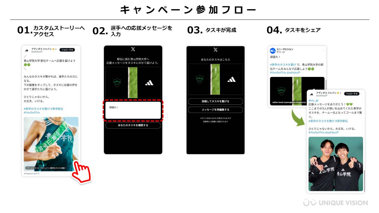 大学駅伝に出場する契約校である青山学院大学・國學院大學・創価大学・大東文化大学への応援メッセージをタスキにのせて選手へ届ける本プロジェクトには、Belugaキャンペーン for Xのカスタムストーリーが活用されています。