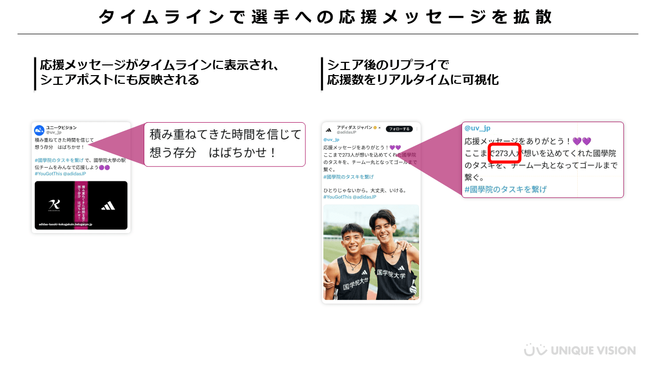 入力した応援メッセージはシェアポストのテキストにも反映され、選手に向けた熱いメッセージがタイムライン上で拡散されました。