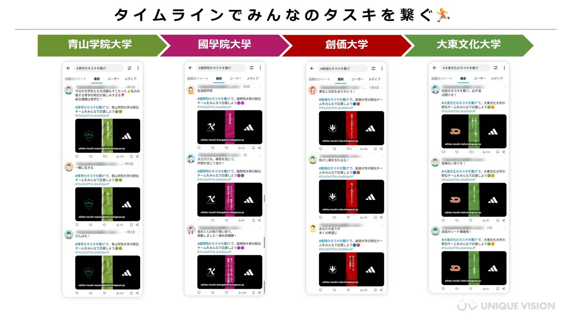 「#青学のタスキを繋げ」「#國學院のタスキを繋げ」「#創価のタスキを繋げ」「#大東文化のタスキを繋げ」という大学ごとのハッシュタグで検索すると、タイムラインに大学ごとの応援メッセージが一列に並びタイムライン上で応援メッセージのタスキを繋ぐことができました。