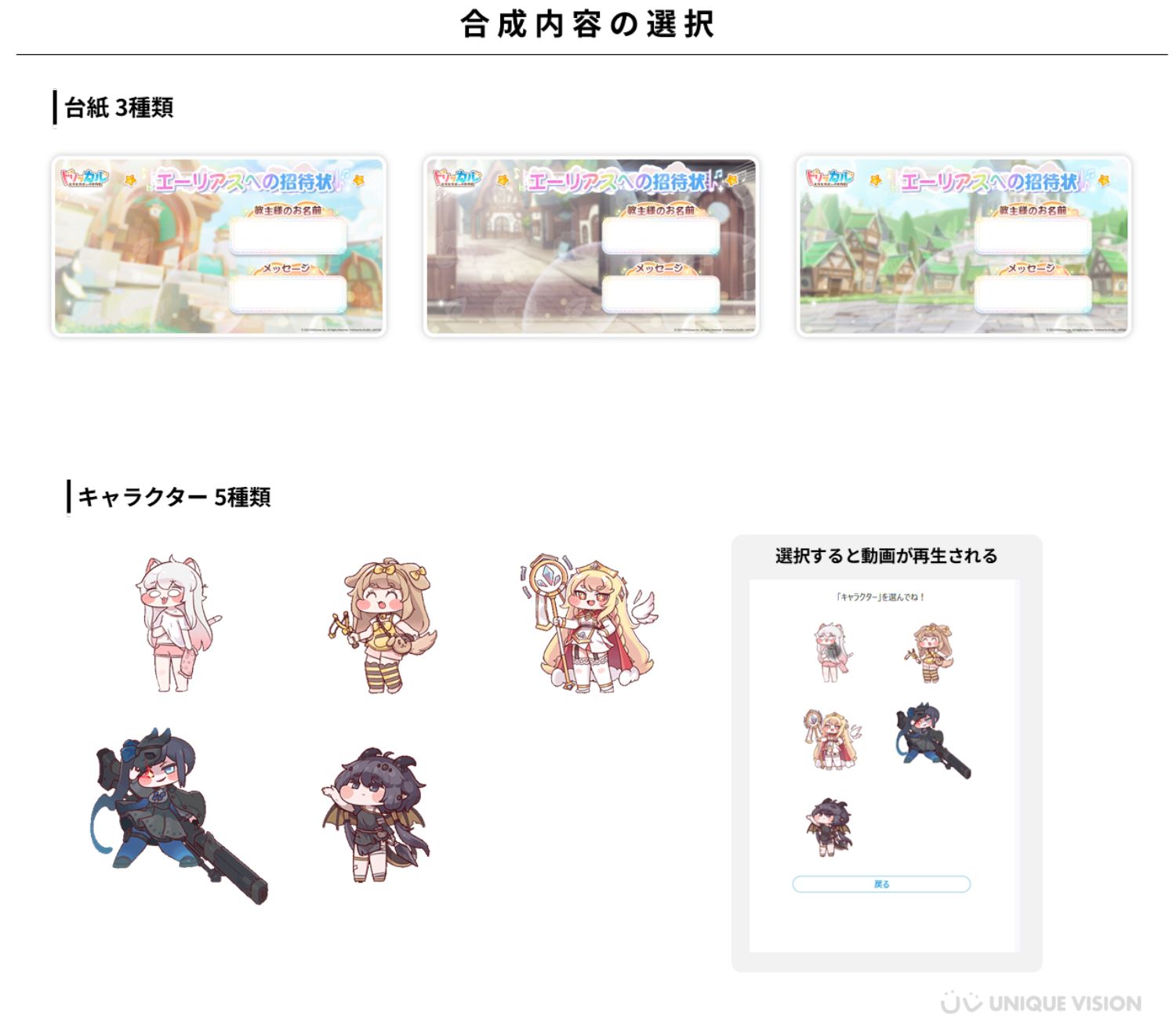 ユーザーは、カスタムストーリー内で用意された素材(①台紙:3種、②キャラクター:5種)を選択し、さらに2箇所の「自由記述テキスト」(招待状の宛名、メッセージ)を入力します。