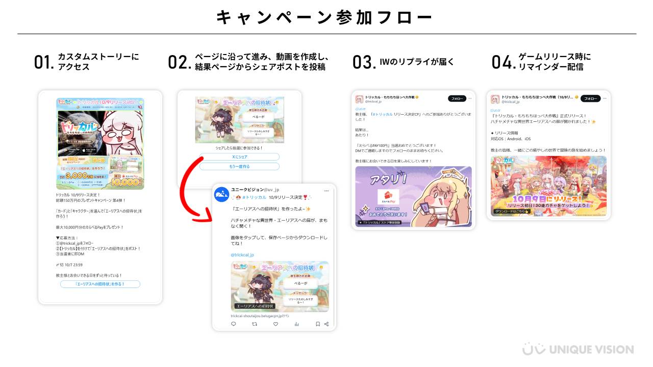 本施策は、「カスタムストーリー」を通じた自分だけのコンテンツ作成により質の高いエンゲージメントを生み出し、「インスタントウィン」で参加と拡散を促進。最後に「リマインダー」機能で、キャンペーン参加者をゲームのダウンロードへと繋げる、一気通貫のプロモーション施策となっています。