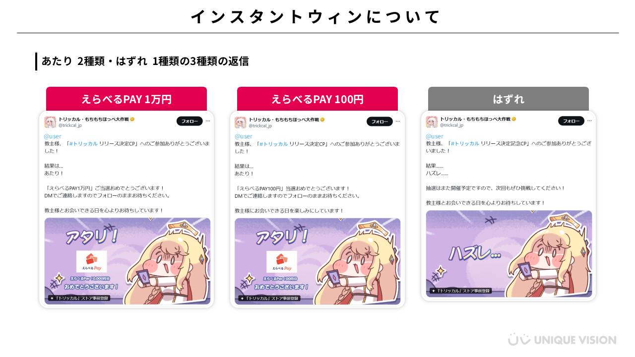 シェア投稿が完了すると、ユーザーには自動でリプライが届き、その場で「えらべるPAY(1万円分または100円分)」の抽選結果が分かります。この即時性の高いインセンティブ設計により、ユーザーの参加意欲を高め、UGCの拡散の最大化が促進されました。