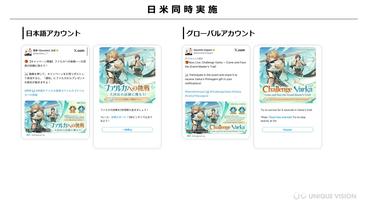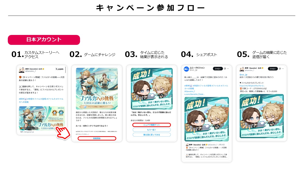 HoYoverseは、オープンワールドRPG『原神』における新キャラクター「ファルカ」の実装を記念して、新キャラクターの認知拡大とX上での新たな体験提供を目的とした「ファルカへの挑戦キャンペーン」をXにて実施しました。 本施策には、Belugaキャンペーン for Xのカスタムストーリー機能およびインスタントリプライ機能が活用されています。