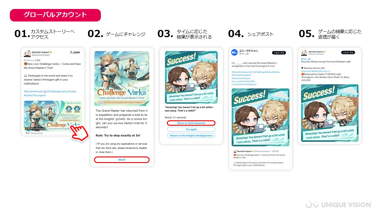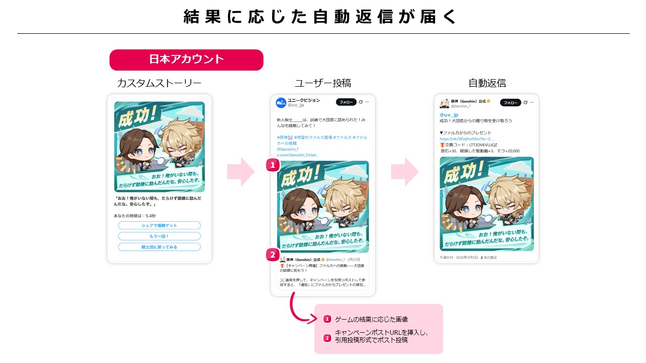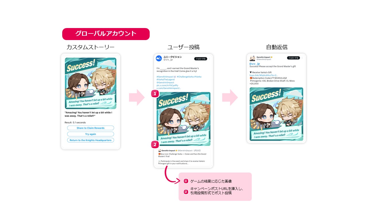 世界中に多くのファンを持つ『原神』の特性に合わせ、本施策は日本語アカウントとグローバルアカウントの両方で同時開催されました。カスタムストーリーや即時返信の内容を日本語・英語の2言語で展開することで、世界中のユーザーへ同時に、かつシームレスなブランド体験を提供しました。