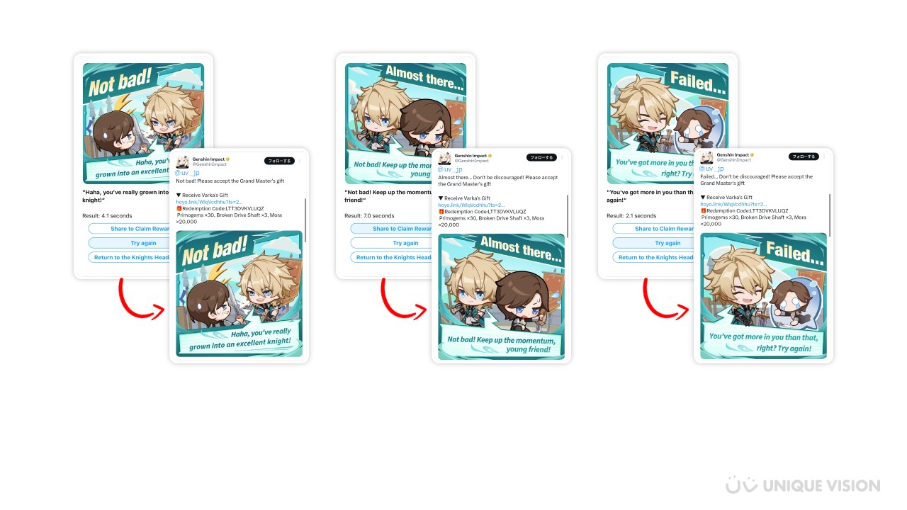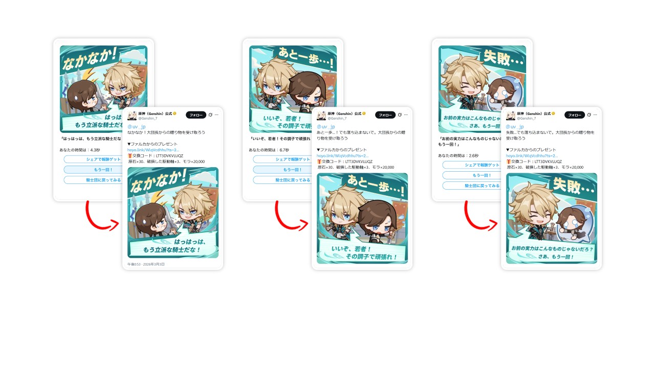 本施策では、シェアポストする結果に応じて、シェアポスト後に届く即時リプライの内容も変化する設計となっていました。リプライすべてに、ゲーム内で使用できる引き換えコードが差し込まれていたため、ユーザーのシェアポスト意欲を高めるだけでなくゲームプレイへと誘導しました。