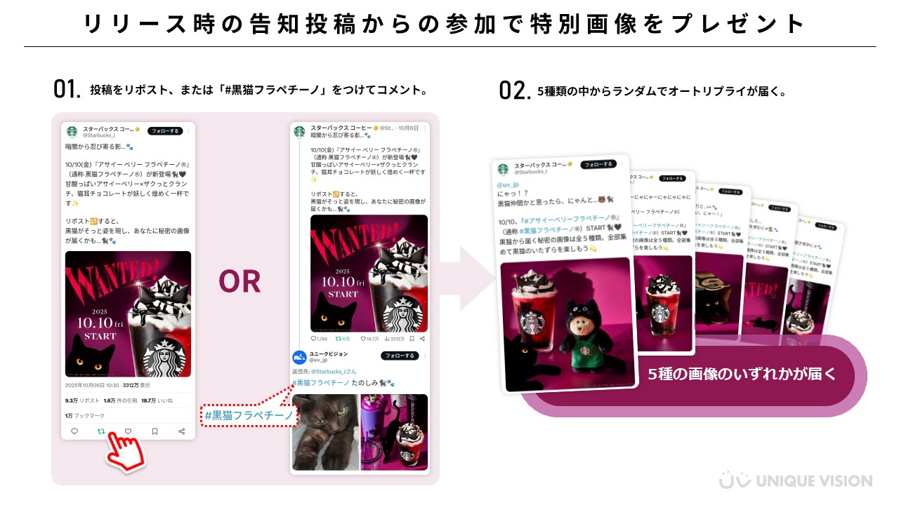 ハロウィンのフラペチーノ®の情報解禁当日に、秘密の黒猫画像がリプライで届く企画を開催しました。