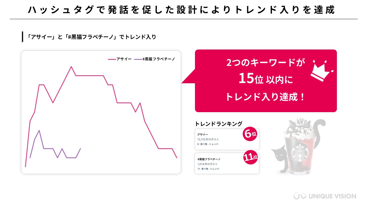 リポストだけではなく、対象投稿へのリプライ(ハッシュタグの発話)も参加条件として設定したことで「#黒猫フラペチーノ」がトレンド入りを達成し、さらに「アサイー」というキーワードもトレンド入りしました。情報解禁のタイミングで黒猫・アサイ―という情報を本施策により拡散したことで、発売前に商品への期待感を高めることに成功しました。