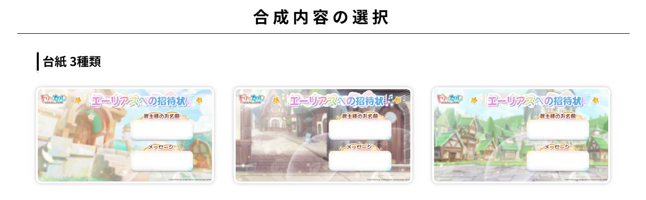 ユーザーは、カスタムストーリー内で用意された素材(①台紙:3種、②キャラクター:5種)を選択し、さらに2箇所の「自由記述テキスト」(招待状の宛名、メッセージ)を入力します。