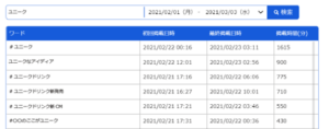 自社や競合企業に関連した気になる/調べたいキーワード(商品名やキャンペーンハッシュタグなど)が、指定期間にトレンド入りしていたかどうかを検索して表示することができます。
