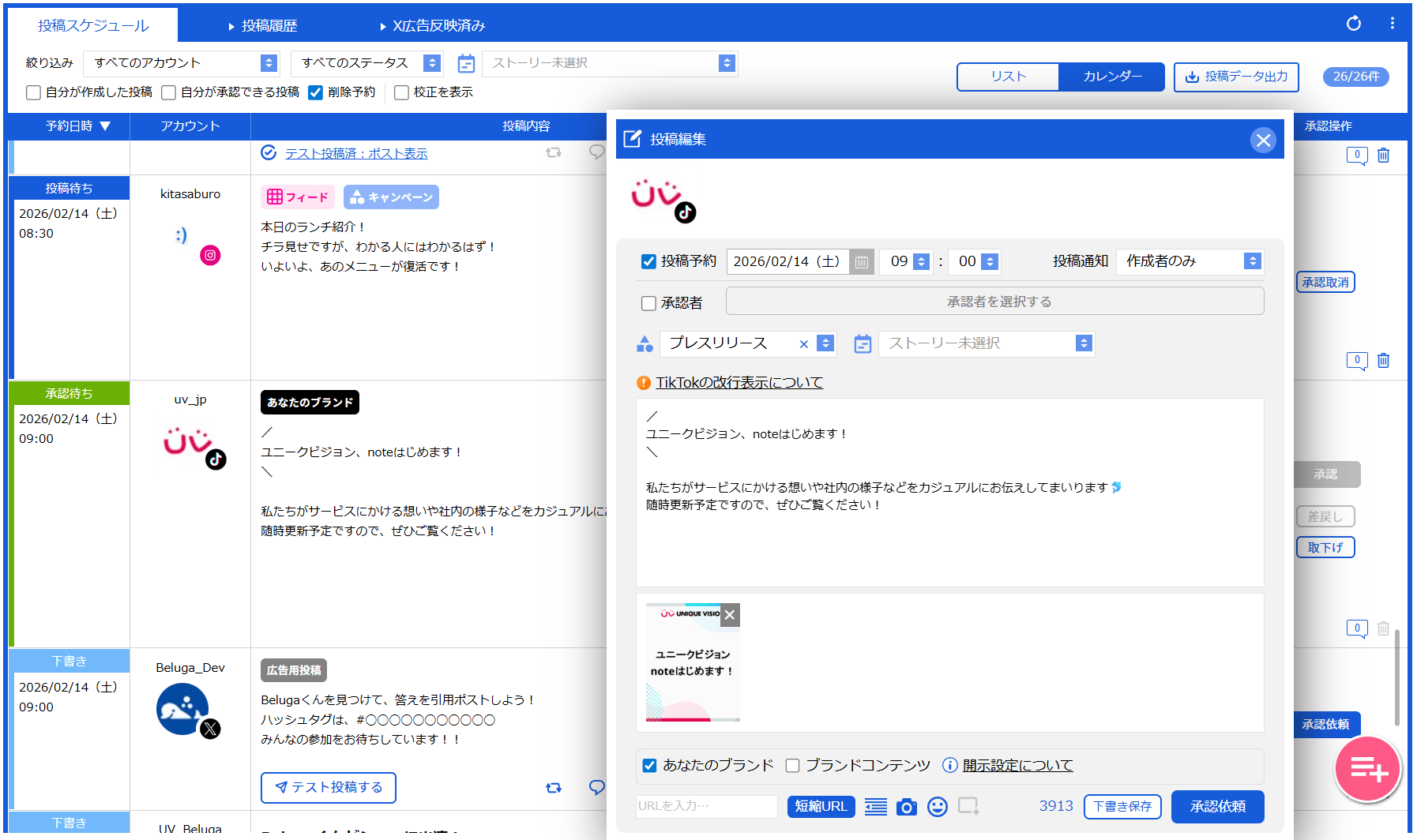 近年、企業のSNSマーケティングにおいてショート動画の活用が進んでおり、特にTikTokは主要なプラットフォームの一つとして広く普及しています。一方で、企業が組織的にアカウントを運用する際「投稿前の社内確認(承認フロー)の徹底」や「複数媒体の横断的な管理」が課題となっていました。