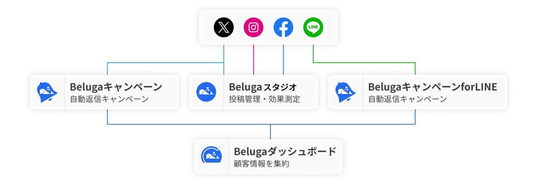 Belugaシリーズでソーシャルメディアの投稿管理及び効果測定、𝕏・LINE・Instagramでのキャンペーン実施やチャットボットなど、SNSマーケティングをより効果的に運営することができます。