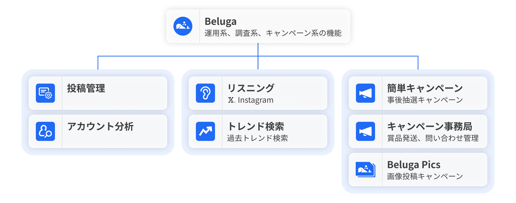 Belugaシリーズの各サービスは以下の機能で構成されています。𝕏を利用した自動返信系の企画はBelugaキャンペーン。𝕏やInstagram、Facebook、Pinterestもの投稿管理、効果測定などの運用管理ツールをご希望の場合はBelugaスタジオ。LINEを利用した自動返信系の企画はBelugaキャンペーン for LINEが最適です。